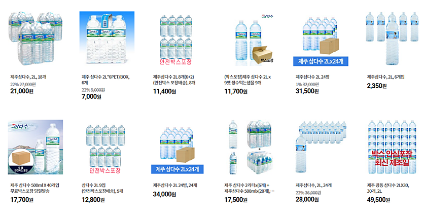 만약 배송비가 무료인 최소 주문금액으로 계산하면 2L 18개 18,000원, 삼다수 500ml 60개 25,800원입니다.